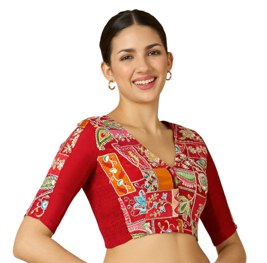 Studio Shringaar Women's Red Pure Viscose Crepe Embroidered Stretchable (Smocked) Saree Blouse (Design 2908)