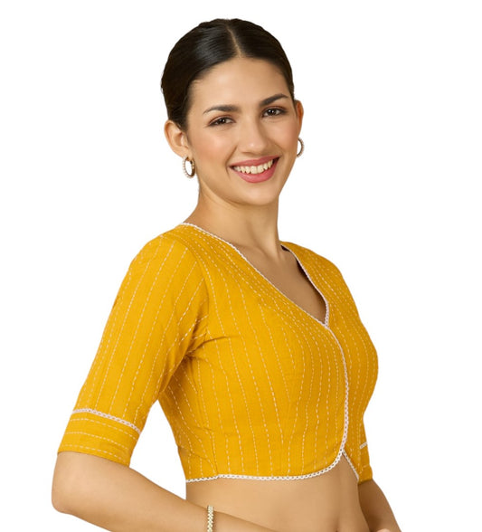 Studio Shringaar Women's Yellow Cotton Handloom V-Neck Readymade Saree Blouse with Off White Stripes (Design 2907)