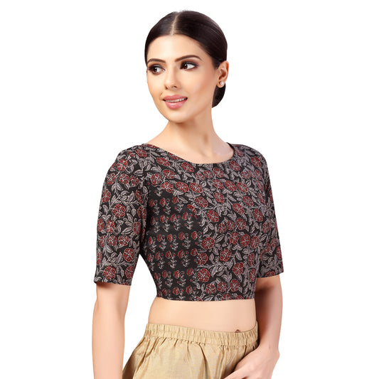 Women's Cotton Elbow Length Block Printed Boat Neck Saree Blouse (2626 - Black and Maroon)