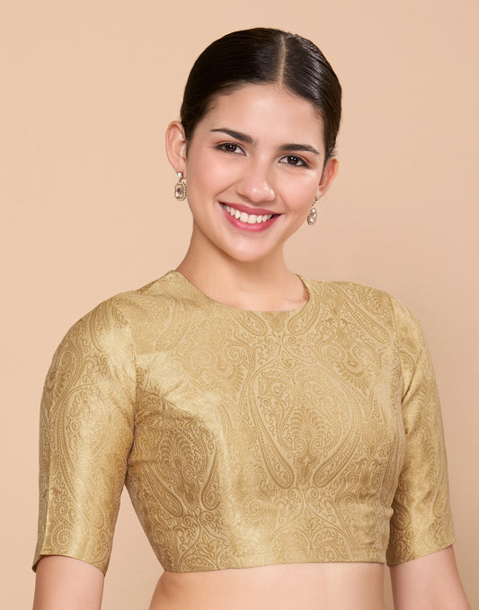 Studio Shringaar Women's Gold Silky Brocade Jewel Neck Readymade Saree Blouse (Design 2867)