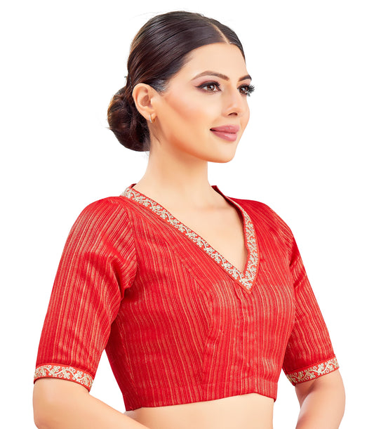 Studio Shringaar Women's Red Georgette (with Golden Stripes) Readymade Saree Blouse(Design 2846)