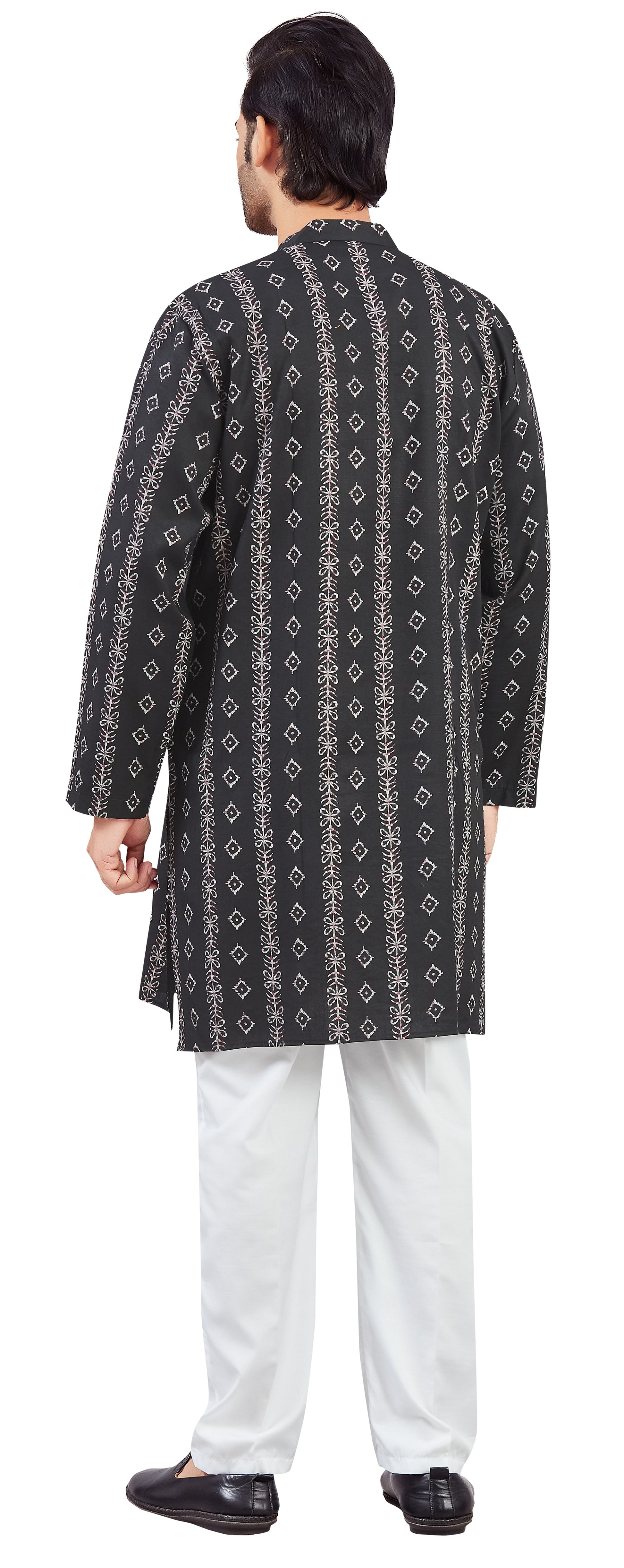 Men's Black Cotton Batik Printed Knee Length Relax Fit Kurta (Design 206)