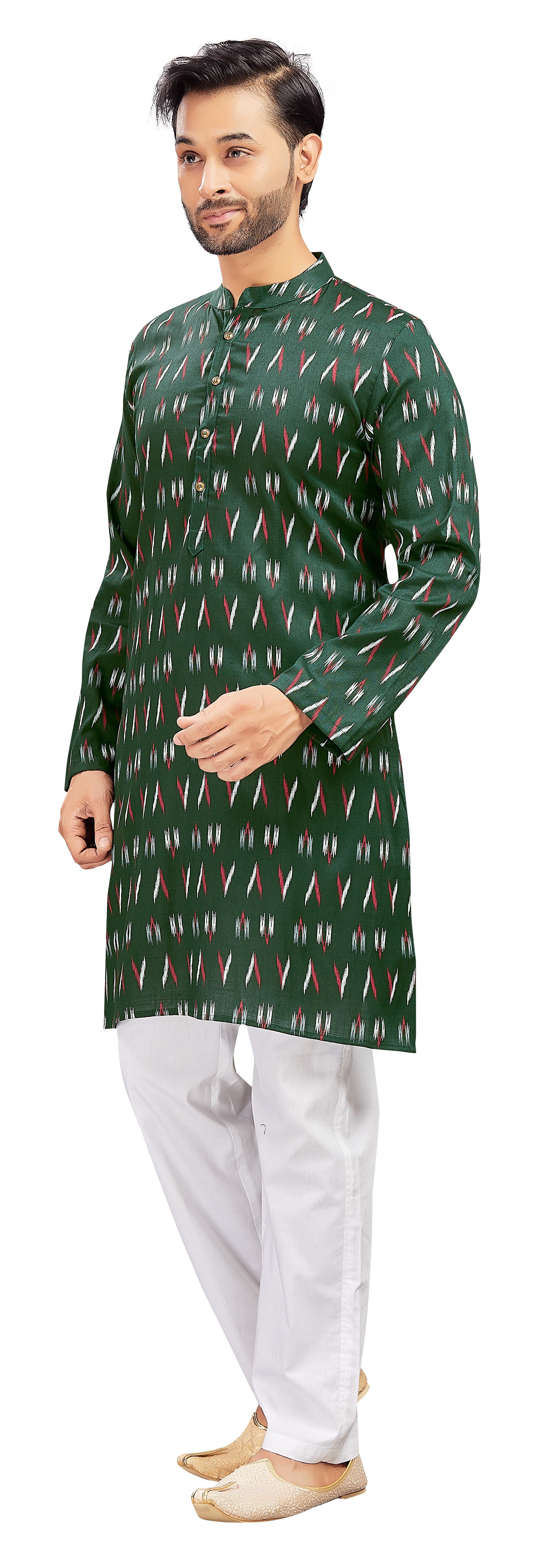 Men's Bottle Green Cotton Ikat Printed Knee Length Relax Fit Kurta (Design 188)