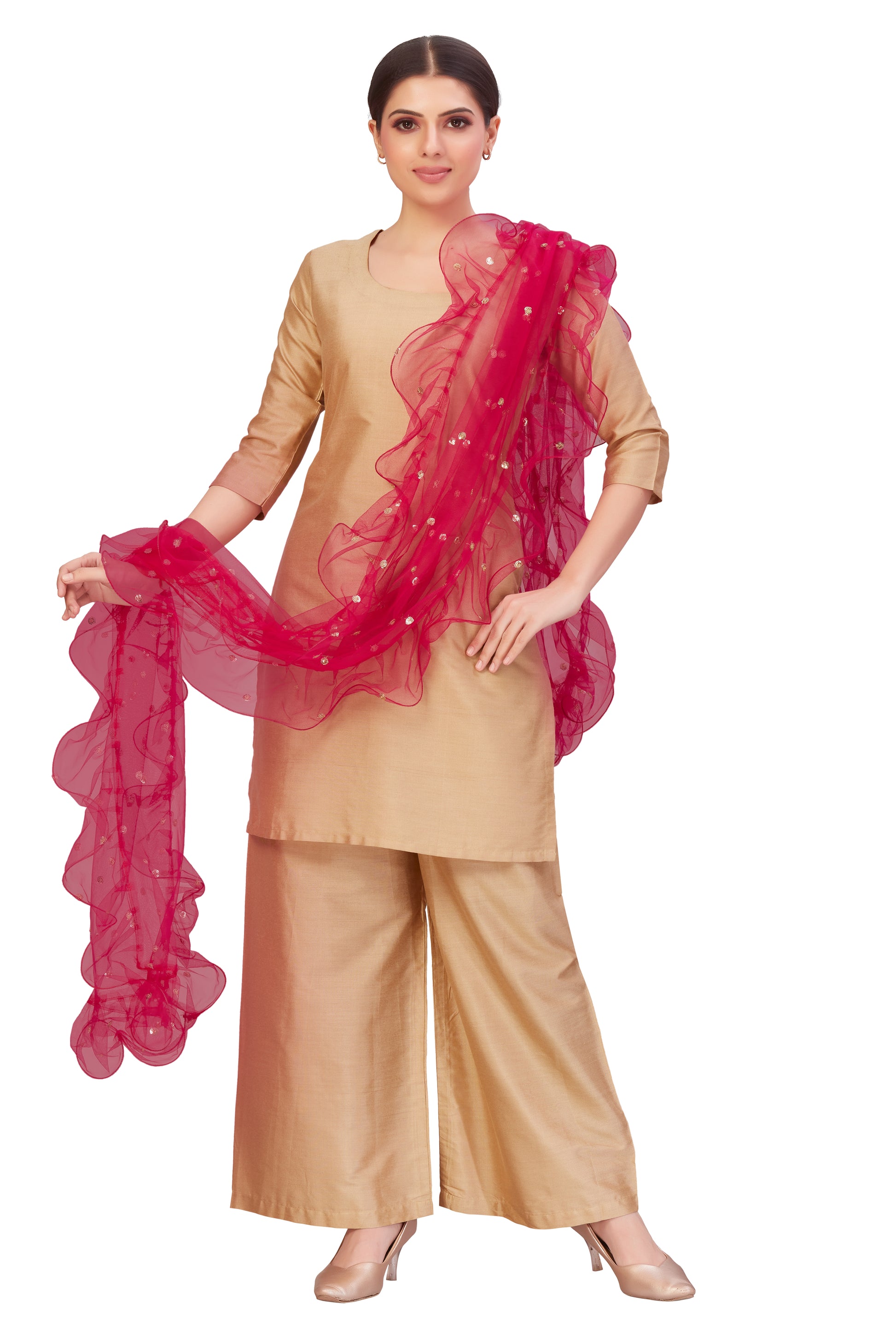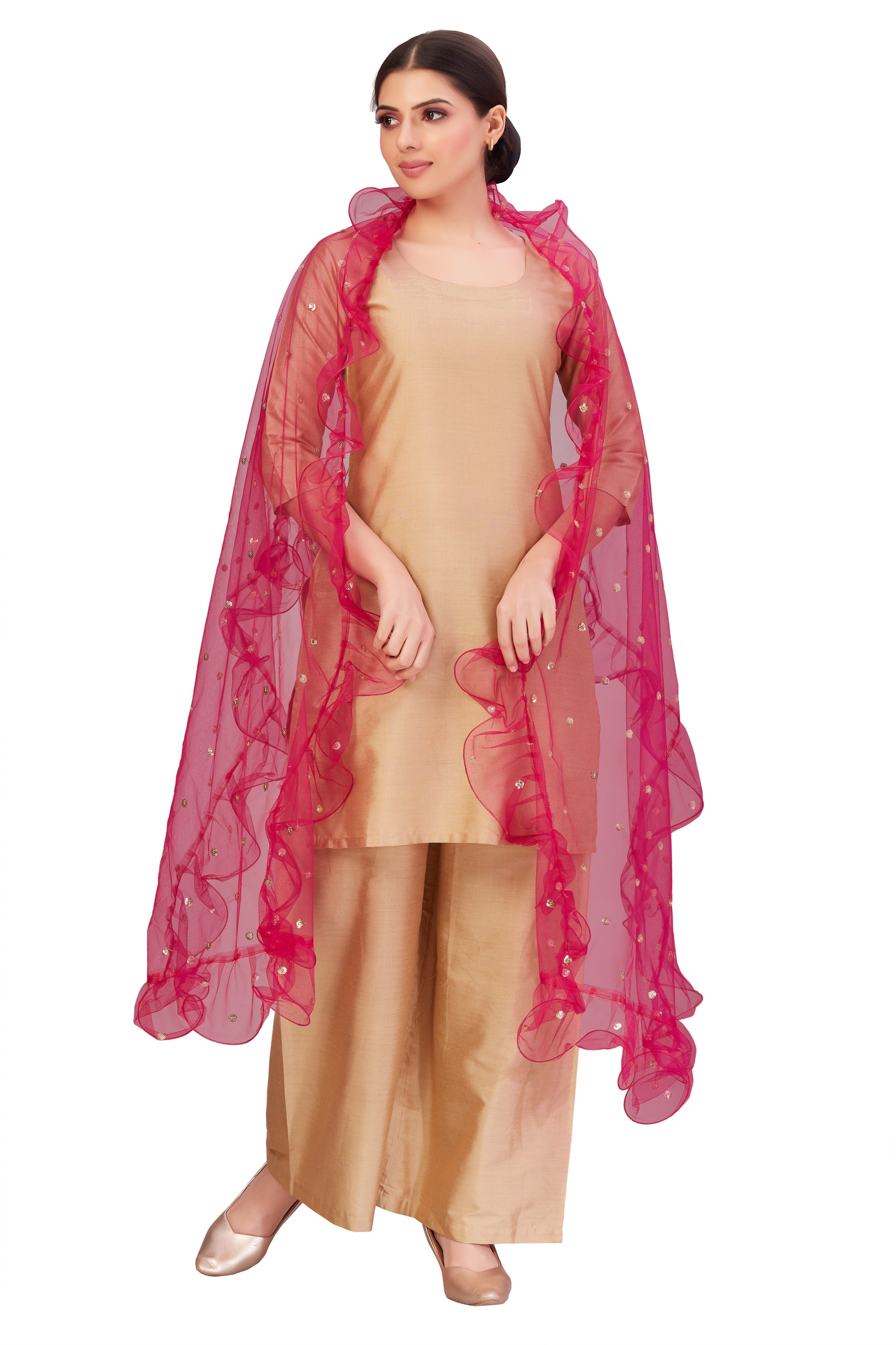 A very delicate RUFFLED fashion dupatta made of soft net fabric. The entire dupatta has sequence dots. This dupatta is very versatile as it is sheer and takes on the colour of the garment you are wearing. We at STUDIO Shringaar make our best effort to give you a full size dupatta which is very comfortable to wear. The size of this dupatta is 28" wide and 2.45 meters long. This dupattas can be teamed with any salwar kameez, lehenga choli, patiyala suit. It is very handy to have these dupattas in your wadrobe. The fabric is very soft and is embroidered with golden zari thread all over the dupatta. The 4 sides are RUFFLED with the same fabric. You will be pleased to own it, in fact all the colours.