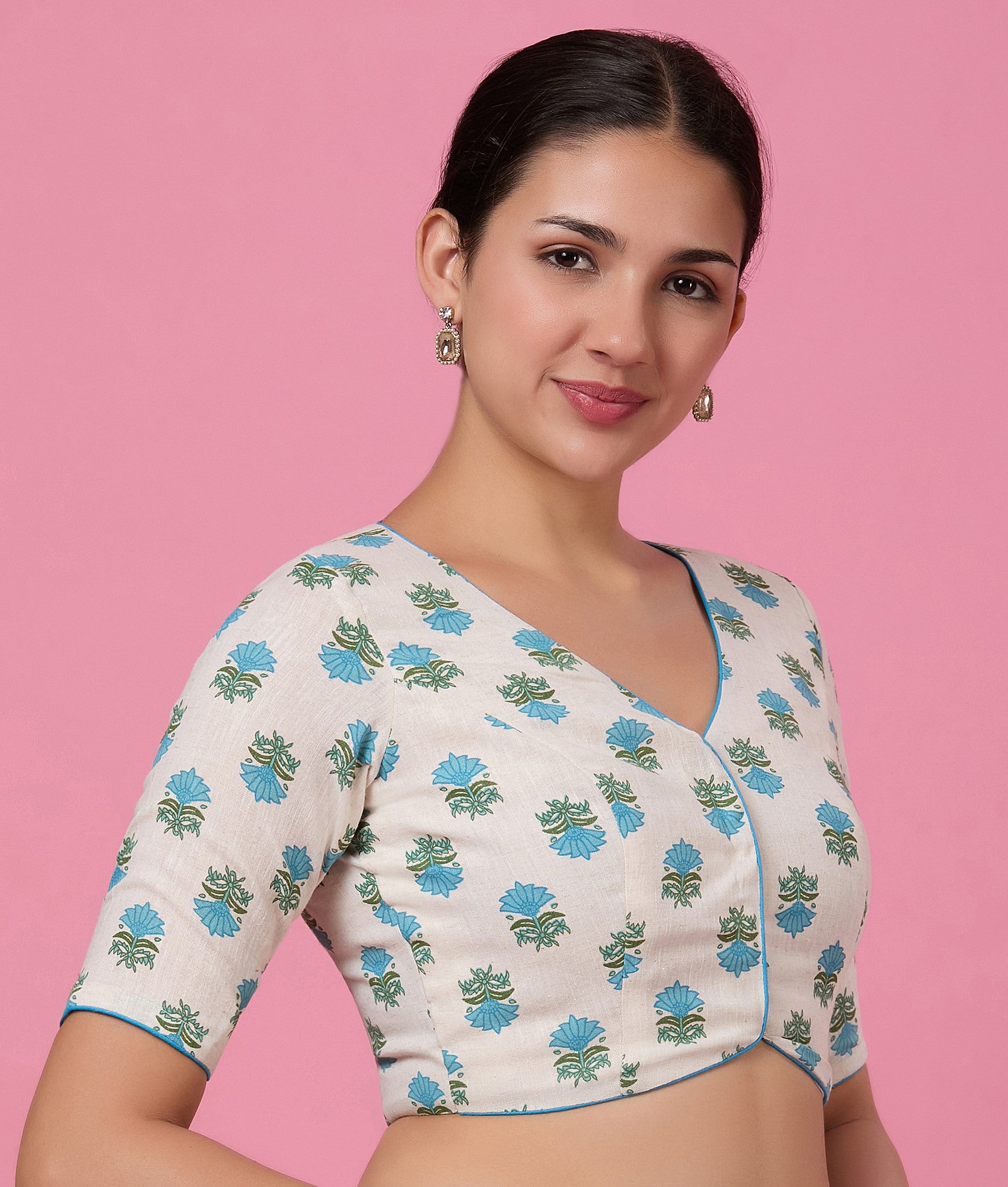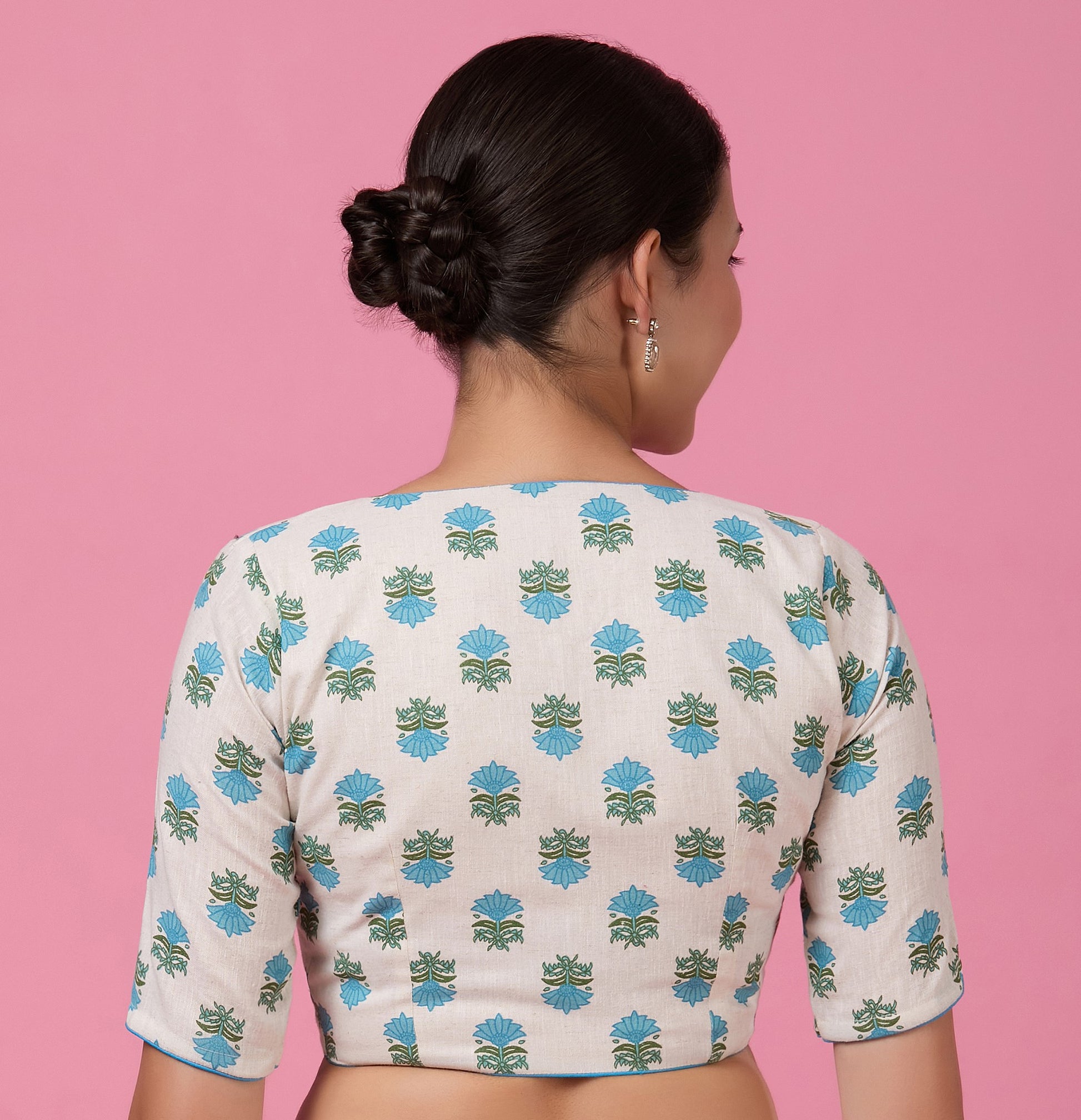 Studio Shringaar Women's Blue Natural Linen Printed Saree Blouse (Design 2876)
