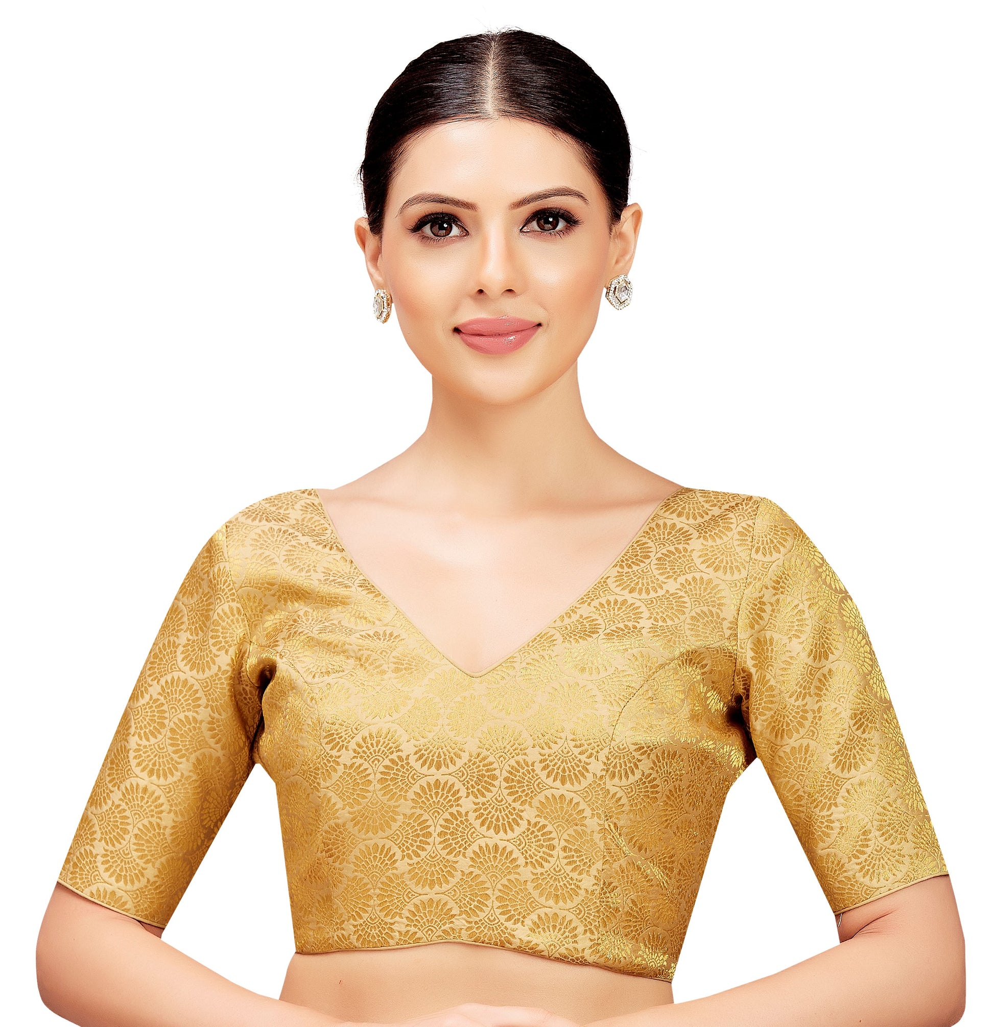 The blouse features a graceful V neckline, elbow-length sleeves, and a secure back hook-and-eye closure. The V-cut back adds a hint of sophistication while keeping the fit functional. It is non-padded for a natural silhouette and includes extra margin on both sides for easy size adjustments. With soft, super-soft fabric against the skin and a tailored shape, this blouse is designed to feel as good as it looks. The blouse length is approximately 15" for sizes 34 and 36, with a slight increase for larger sizes. For the perfect fit, follow this simple formula: BRA SIZE + 2 — for example, if your bra size is 34, order size 36; if it’s 36, choose size 38.