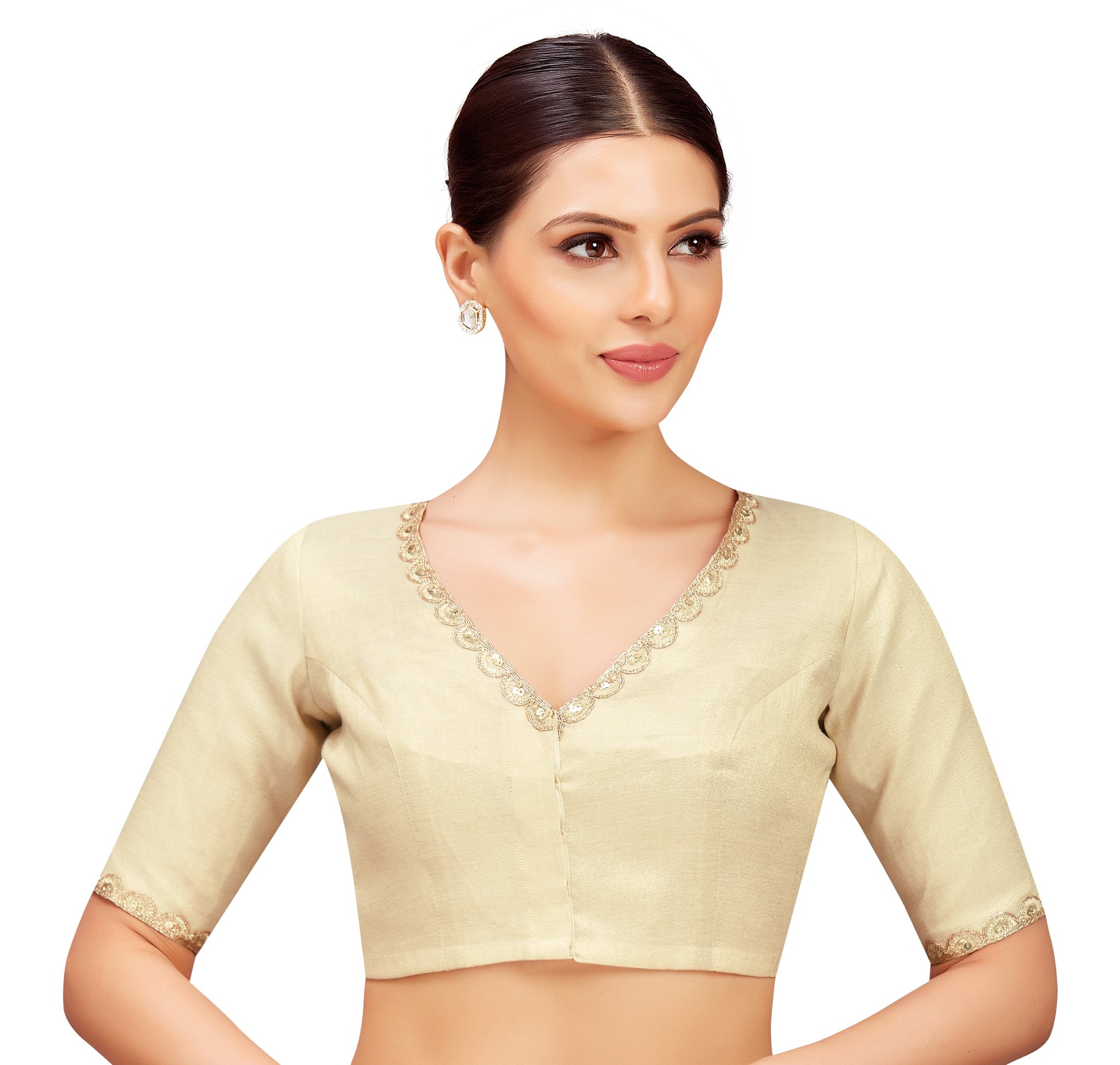 Designed in soft polyester and lined with breathable cotton, this blouse offers both comfort and a flattering silhouette. It features a V neckline, elbow-length sleeves, and a front hook-and-eye closure for secure wear. The non-padded structure provides a natural feel, while extra margins on the sides ensure ease of size adjustments. The high-back design adds to the support and structure. The blouse length is approximately 15" for sizes 34 and 36, with slight variations for larger sizes. For best sizing, follow this formula: BRA SIZE + 2 — for example, if your bra size is 34, choose size 36.