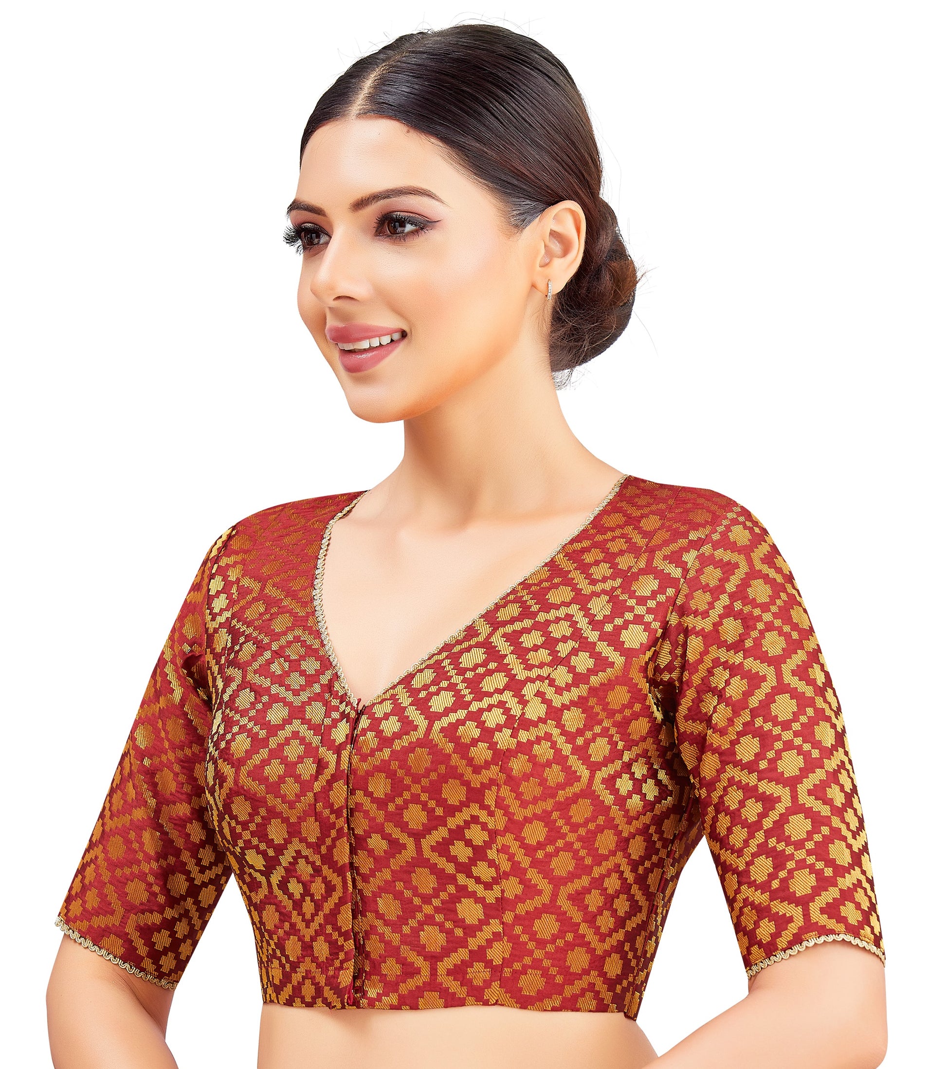 Studio Shringaar Women's Maroon Benaras Brocade V-Neck Readymade Saree Blouse (Design 2850)