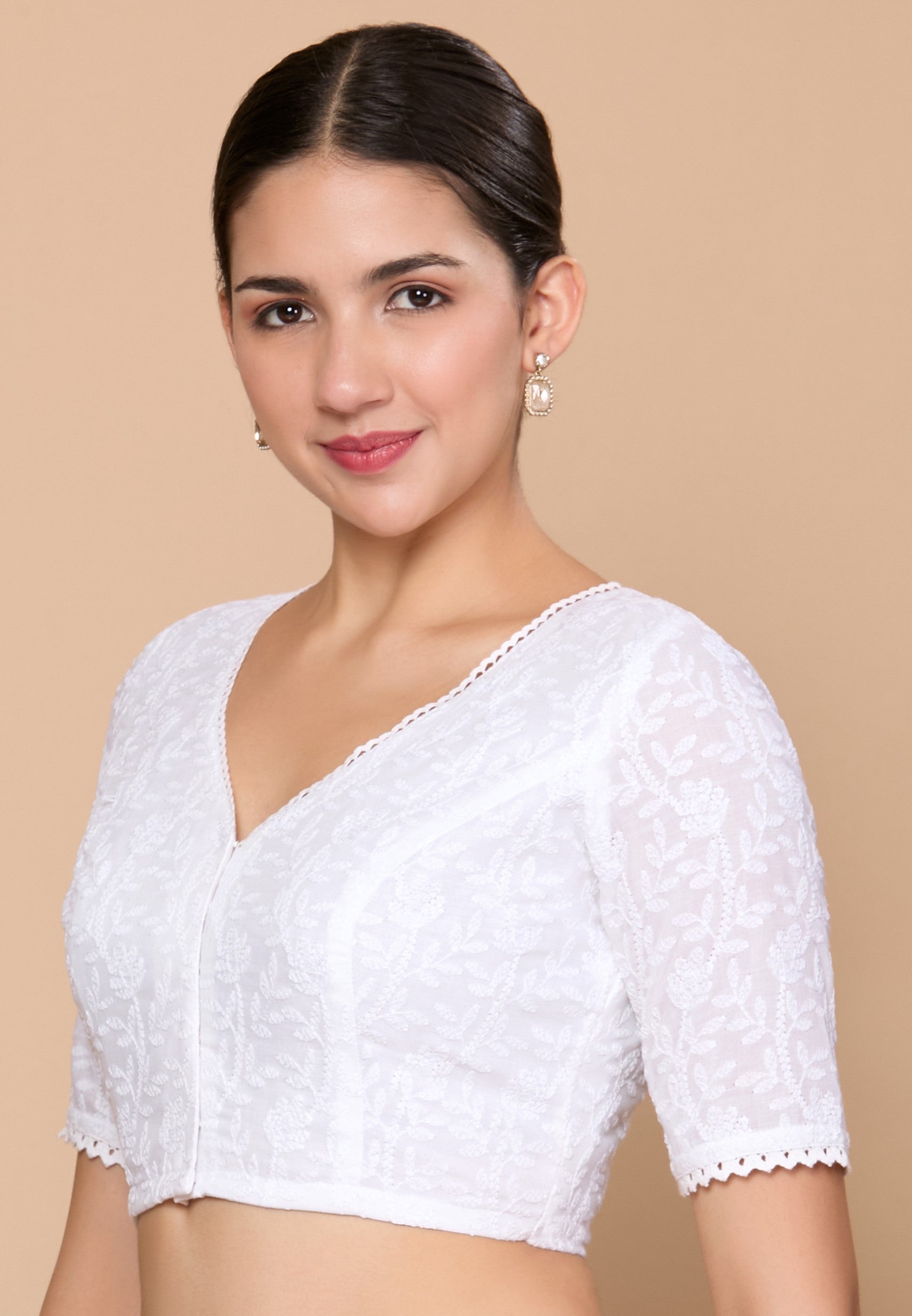 Studio Shringaar Women's White Summer Cotton Chikankari Saree Blouse (Design 2870)