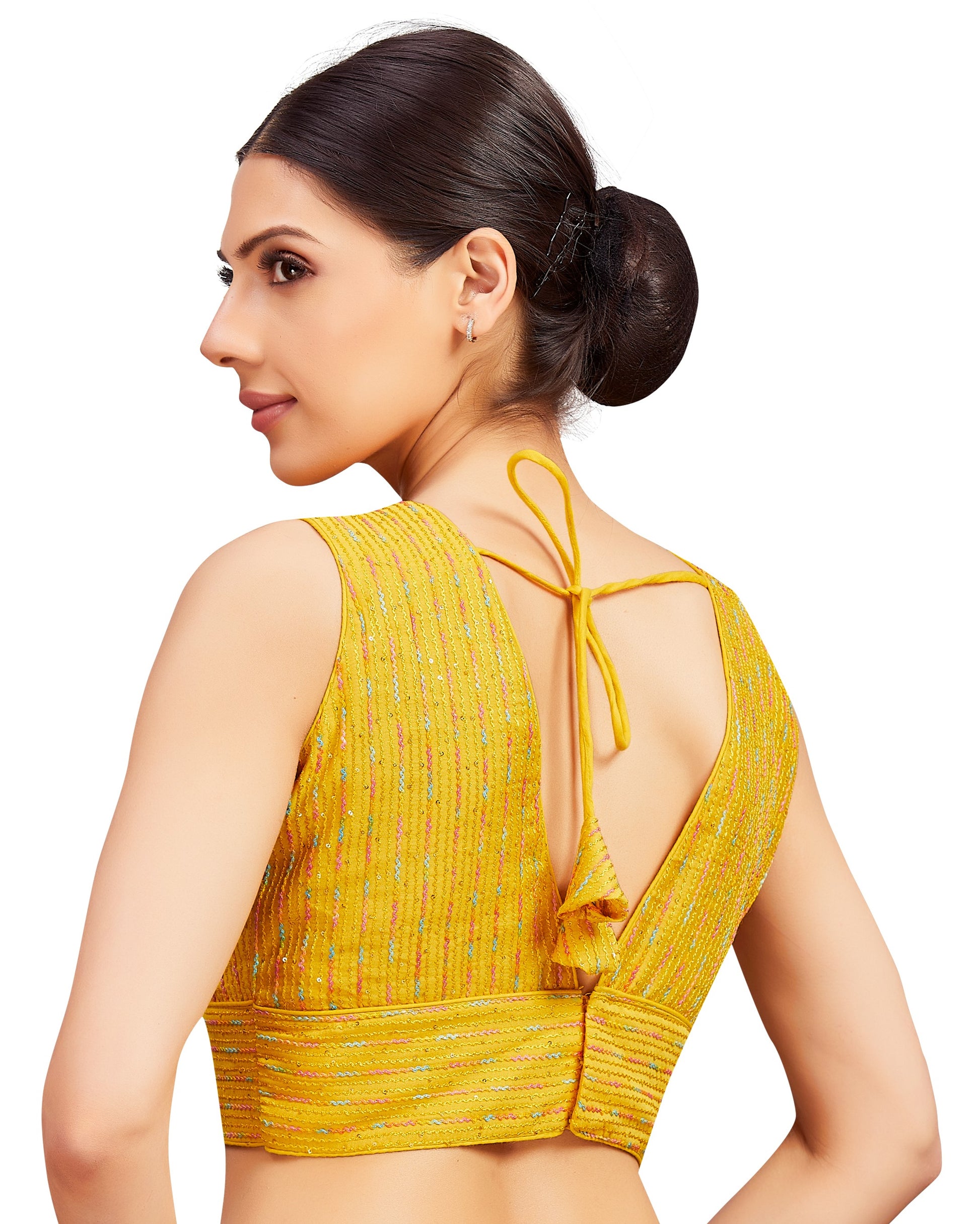 Women's Yellow Embroidered V Neck Sleeveless Padded Saree Blouse (Design 2726)